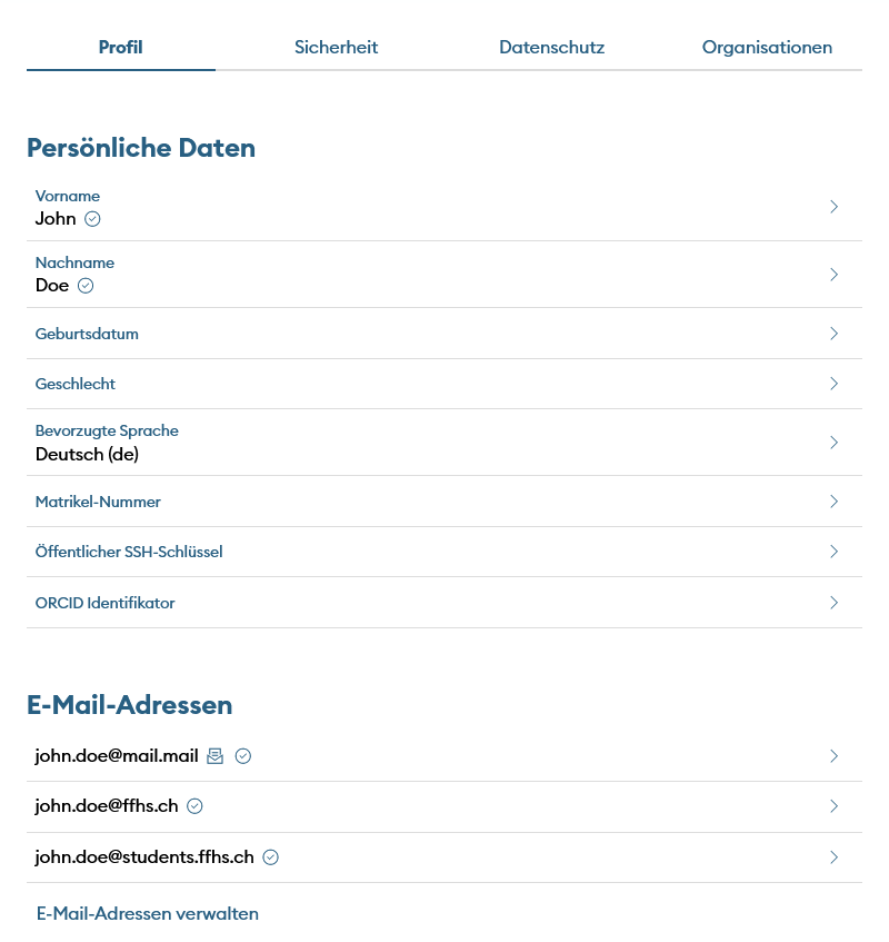 Bitte hinterlegen Sie in Ihrem edu-ID-Account stets Ihre private E-Mail-Adresse. Falls Sie mehrere E-Mail-Adressen erfassen, stellen Sie sicher, dass als Kontaktadresse immer Ihre private E-Mail-Adresse hinterlegt ist (keine @ffhs.ch- oder @students.ffhs.ch-Adresse). So gewährleisten Sie, dass Sie auch nach einem Austritt bzw. nach der Exmatrikulation weiterhin Zugriff auf Ihren edu-ID-Account haben.